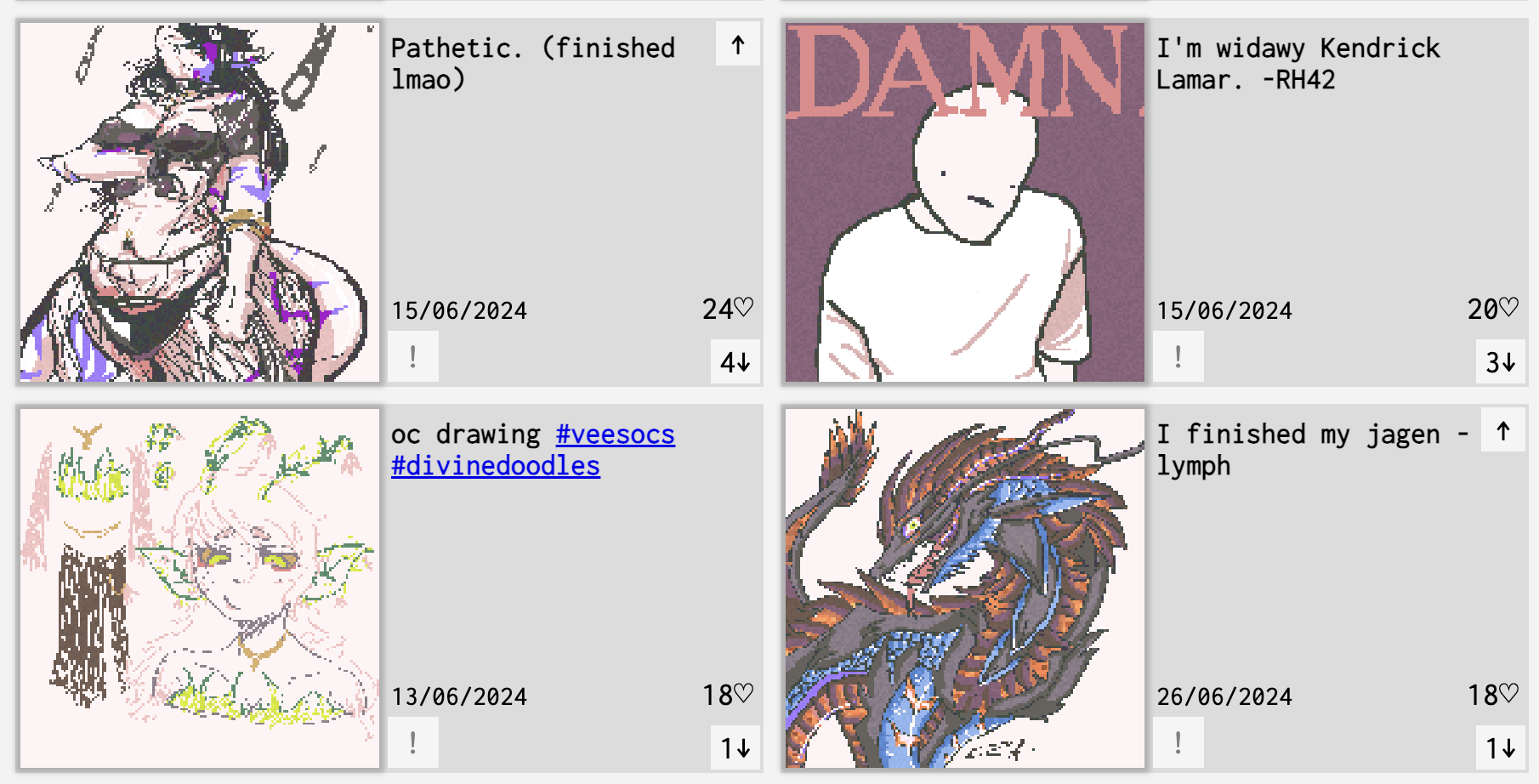 But the occasional commenter explains why: They've already tried those "real" drawing tools, and it goes badly. They can't handle the pressure of the blank canvas, and the expectation to make something good. But in Sandspiel, they feel free to draw to their heart's content. And they feel free to share their work with the world.