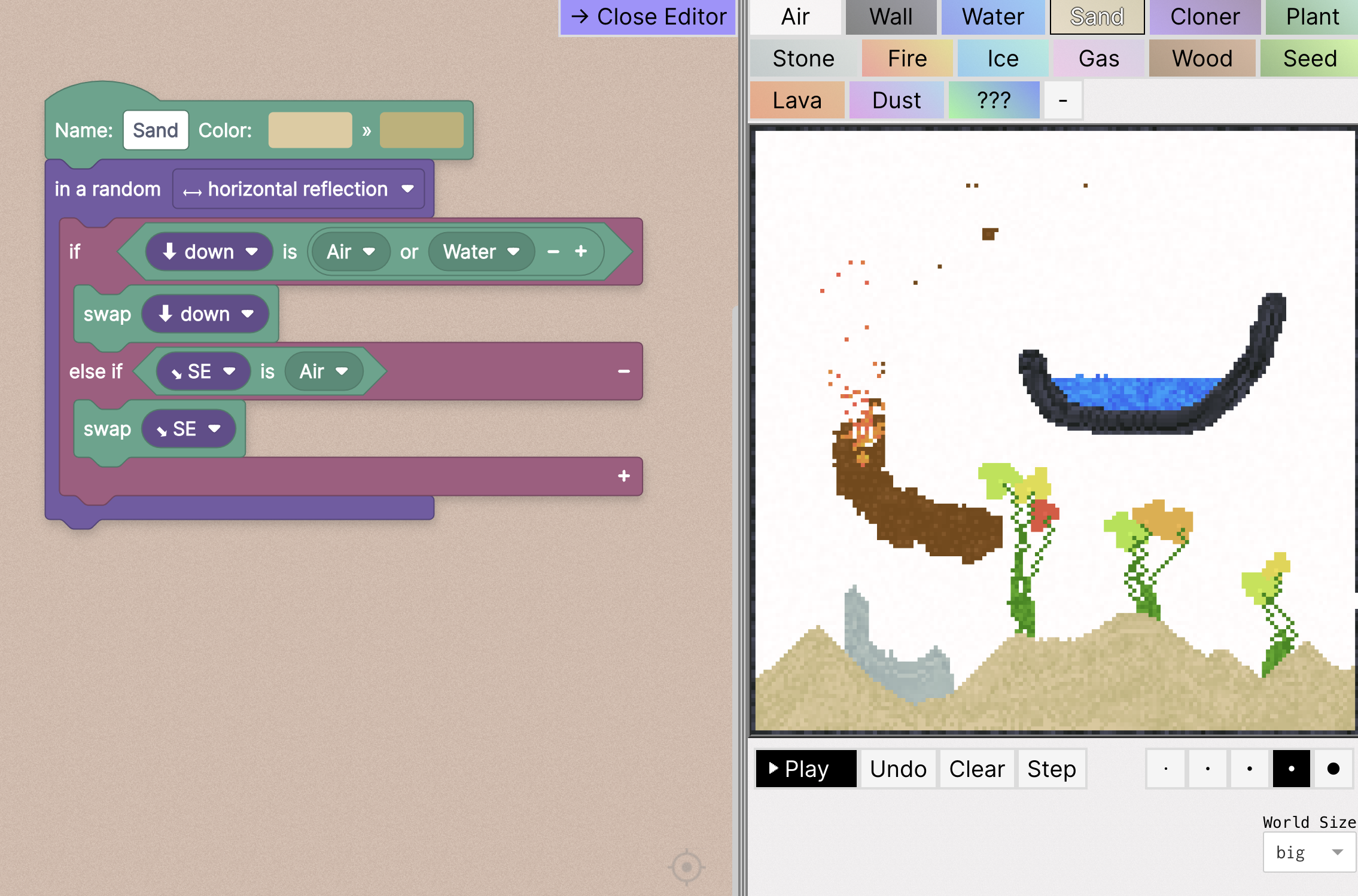 Sandspiel Studio is a live programming tool that I worked on with Max Bittker, the creator of Sandspiel. It's an end-user-programmable version of Sandspiel. Users can use its block-based code editor to change how the elements behave and look.